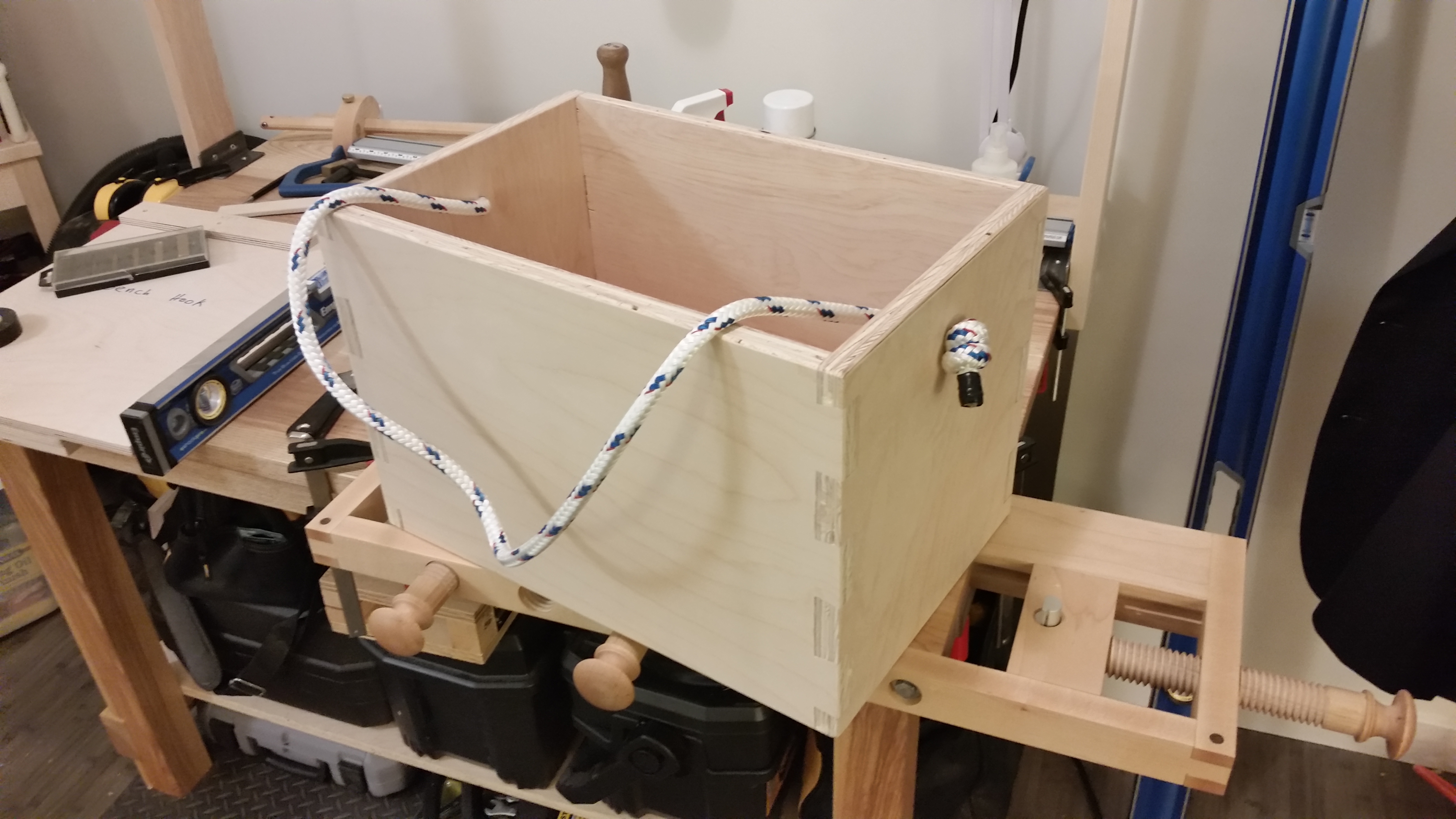 I had the idea of threading some 7/16″ nylon line from the boating supply store to make a rope handle. I tested a couple different lengths and finally settled on a single strap that I could sling over my shoulder (as opposed to individual handles on the ends). I hope I don’t regret the shortcut.