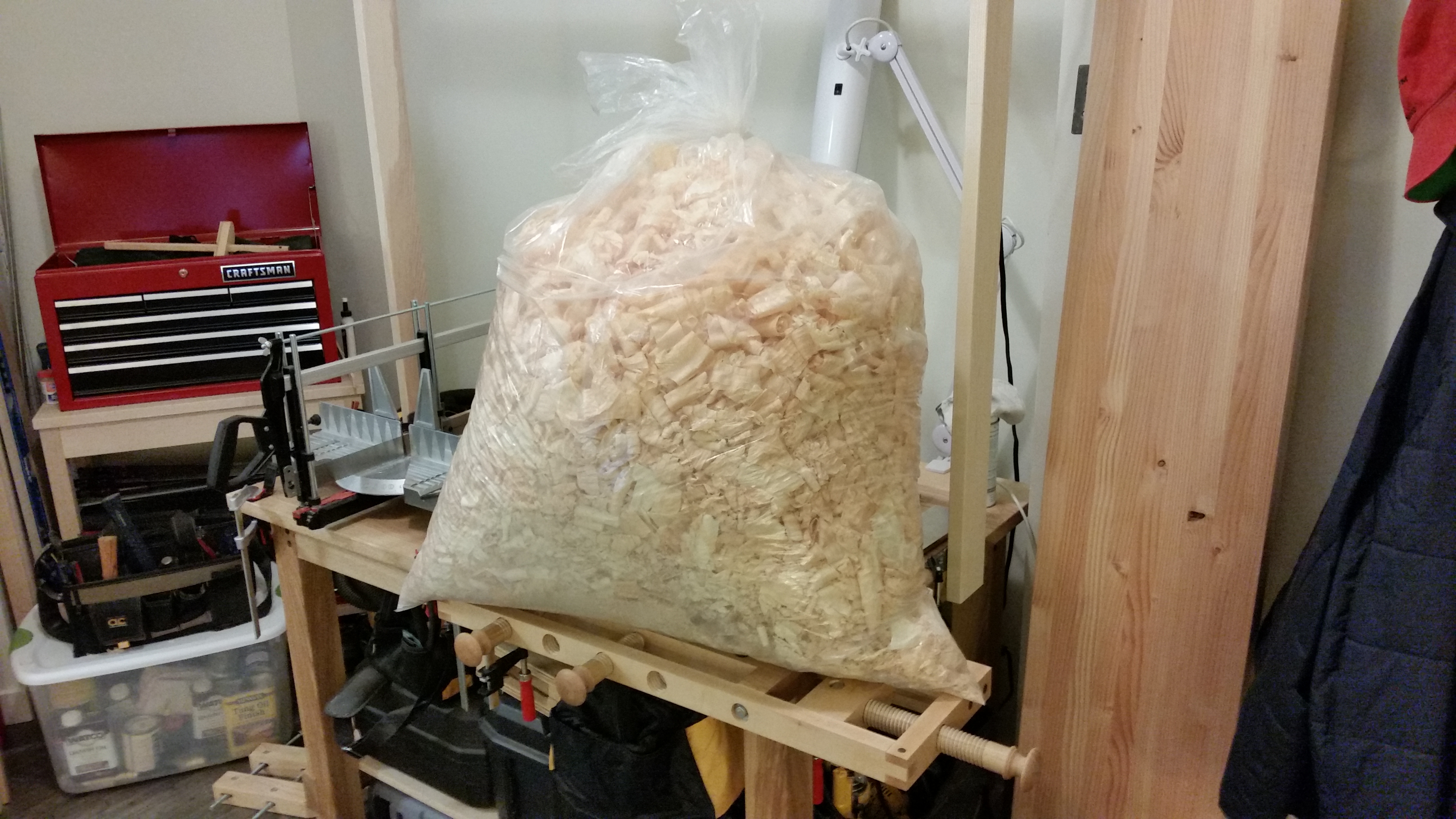 I set up my apartment woodworking shop just over three months ago, and I’m proud to report I just filled my first drum liner full of shavings!