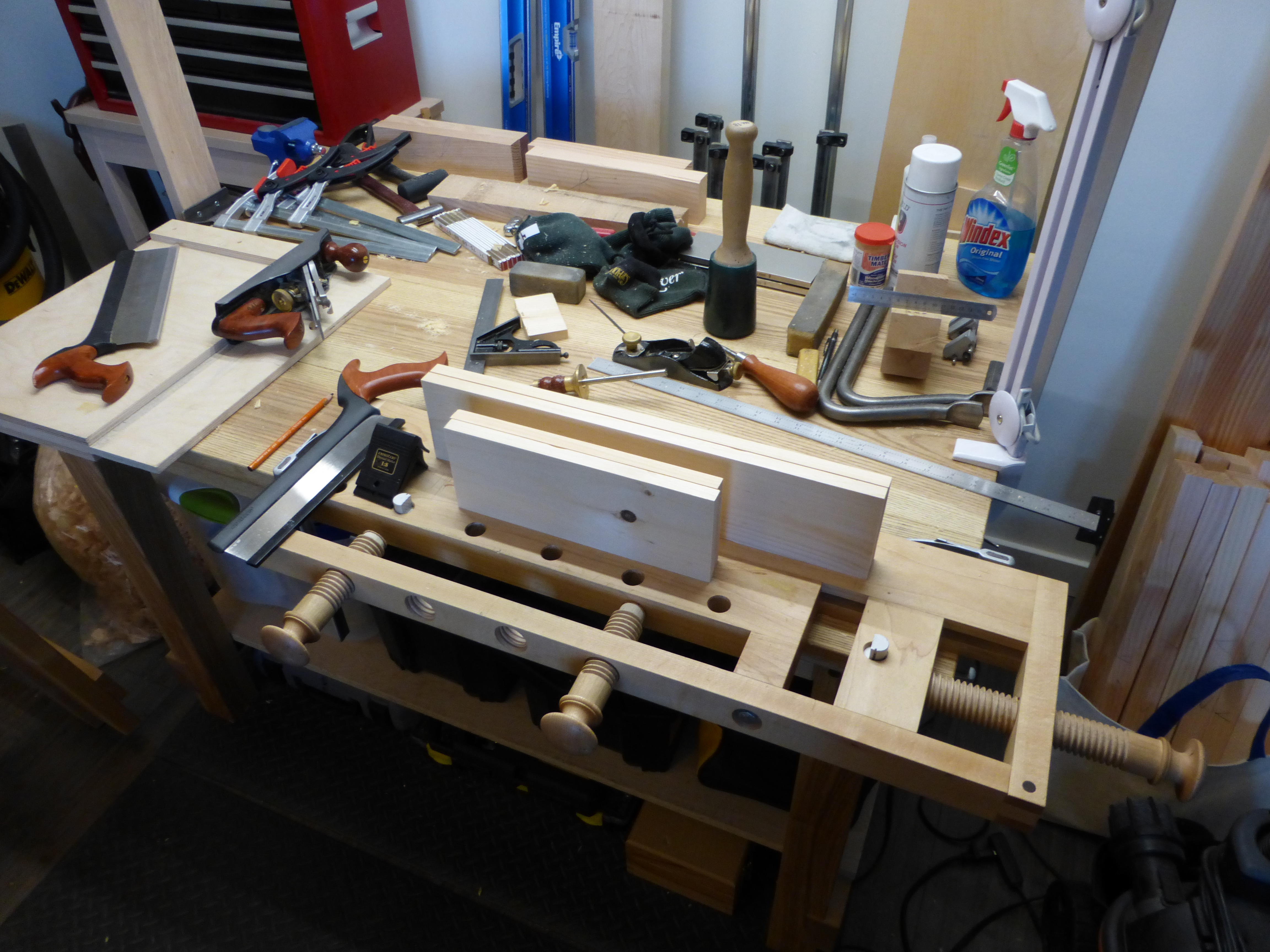 I haven’t yet prepared the base, but I’ve got about 24 board feet of select pine for an eventual tool-chest project from which I can borrow when I get some time next weekend. I also need to smoothing plane off the pencil marks and flush the joints, but I’ll get to that next weekend as well.