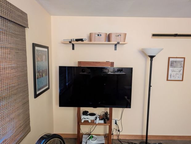 But then, the other day, I decided to hang a wall shelf and what do I notice? There is actually a 1/4″ downward slope in the floor across just 24 inches. I know for a fact the TV easel is square to the base; I built it myself. But you can clearly see the TV leans to the right compared to the wall hung shelf. Just look at it, face on. And the right side of the easel is exactly where the front of my workbench was when this was my shop.