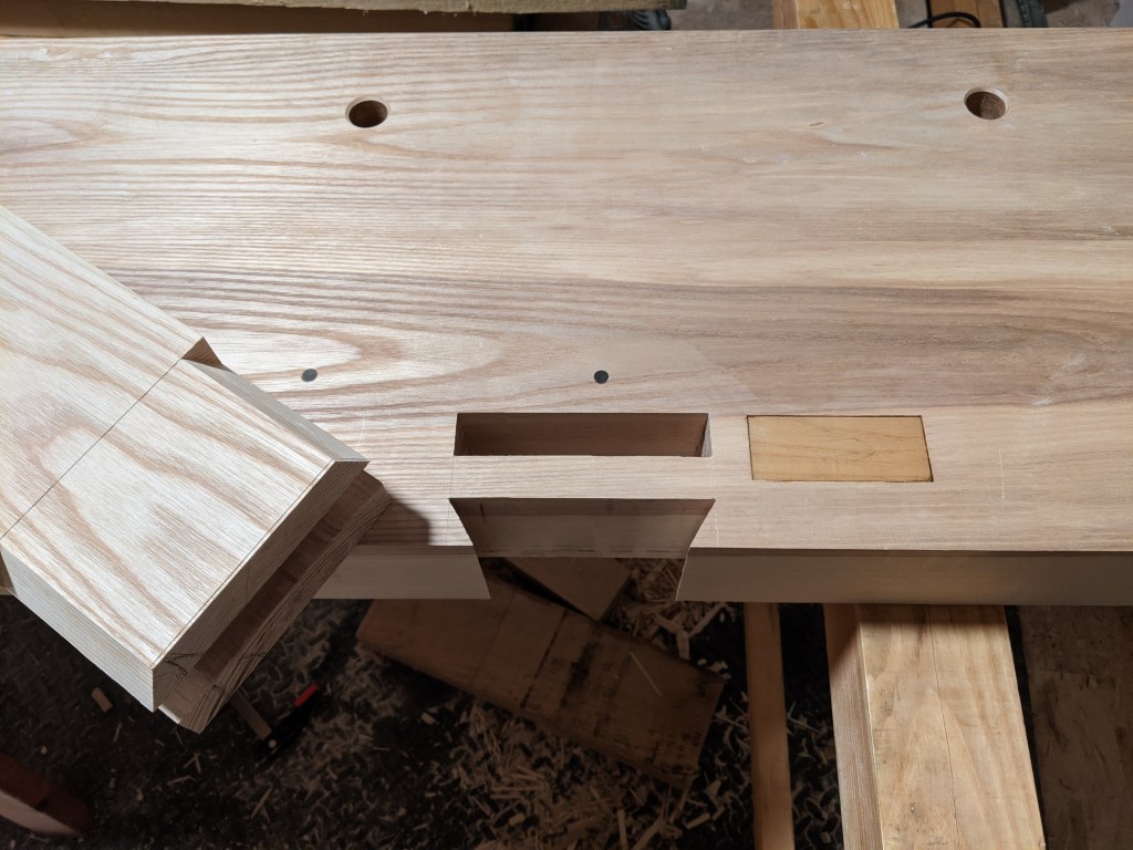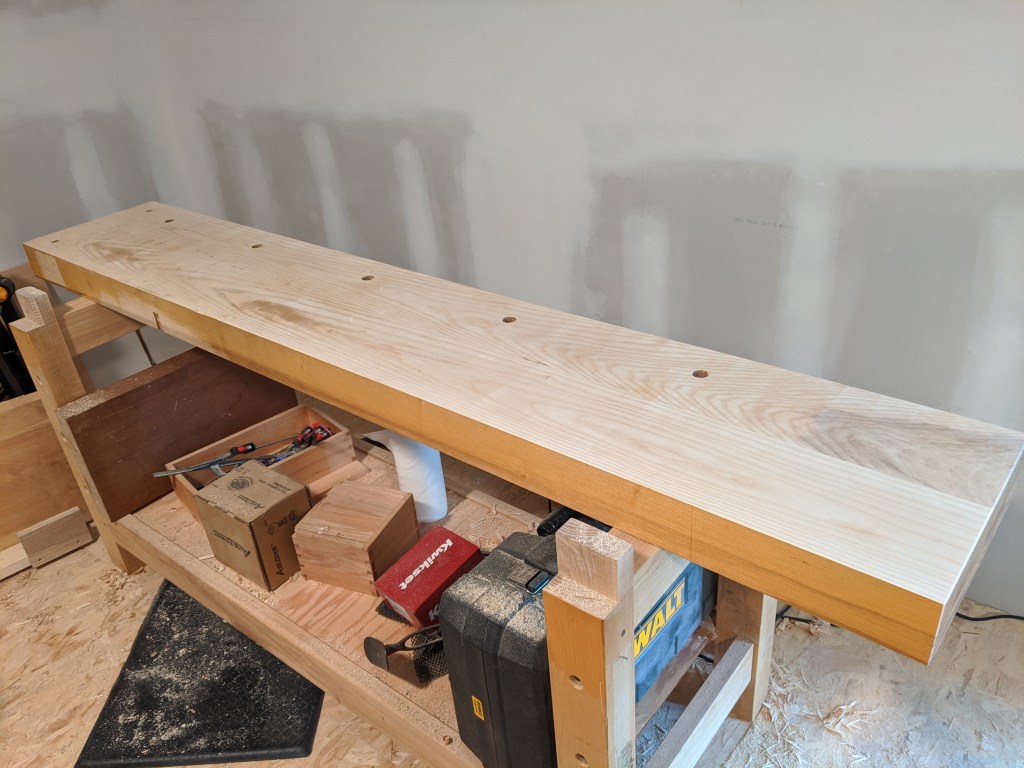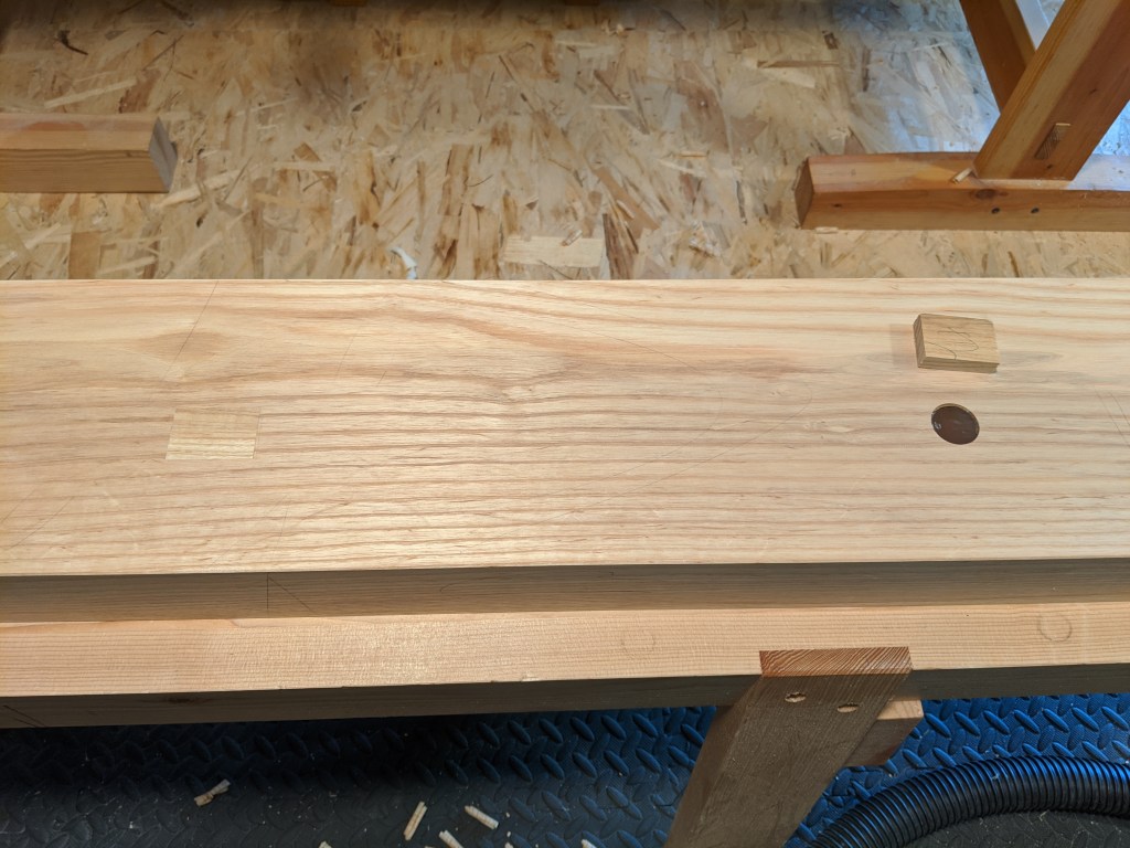 I was never able to sell my old workbench, so cut the back wing off the slab and set that side after plugging the holdfast holes with epoxy and covering them with poorly matching dutchmen. That repurposed wing is still about 3″ thick and 7 inches wide and will become something, eventually. Probably a mantle, if I’m being honest.