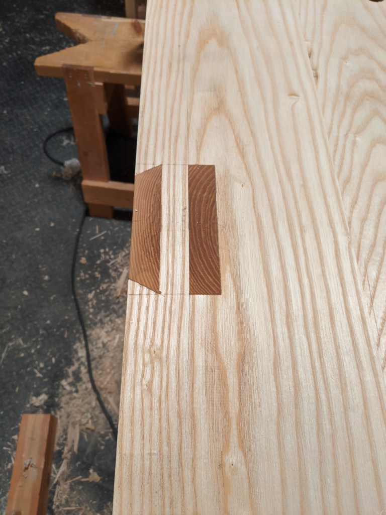 The main slab was still about 3.75″ thick, even after several flattenings. It’s 90″ long and about 15″ wide, consisting of two boards edge glued together. It started as a single, 180″ long piece of 16/4 ash, as a reminder. And after 5 years or so seems to be pretty dry and stable. And the holdfast holes are still pretty plumb even after all that flattening. This is no 6″ thick, 24″ wide slab of green red oak. 15″ is far too narrow for all four legs to be straight up and down (the bench would be too tippy).