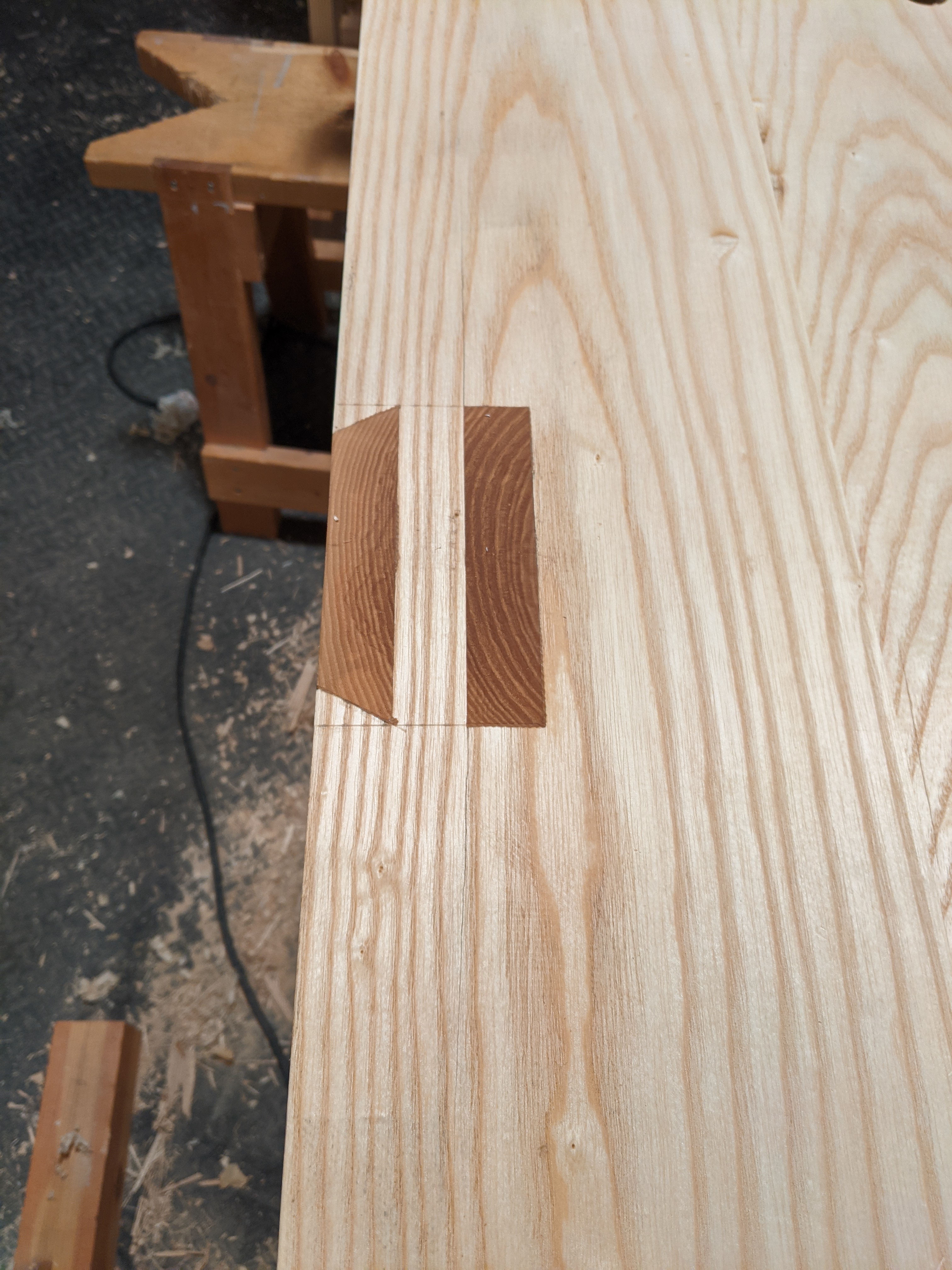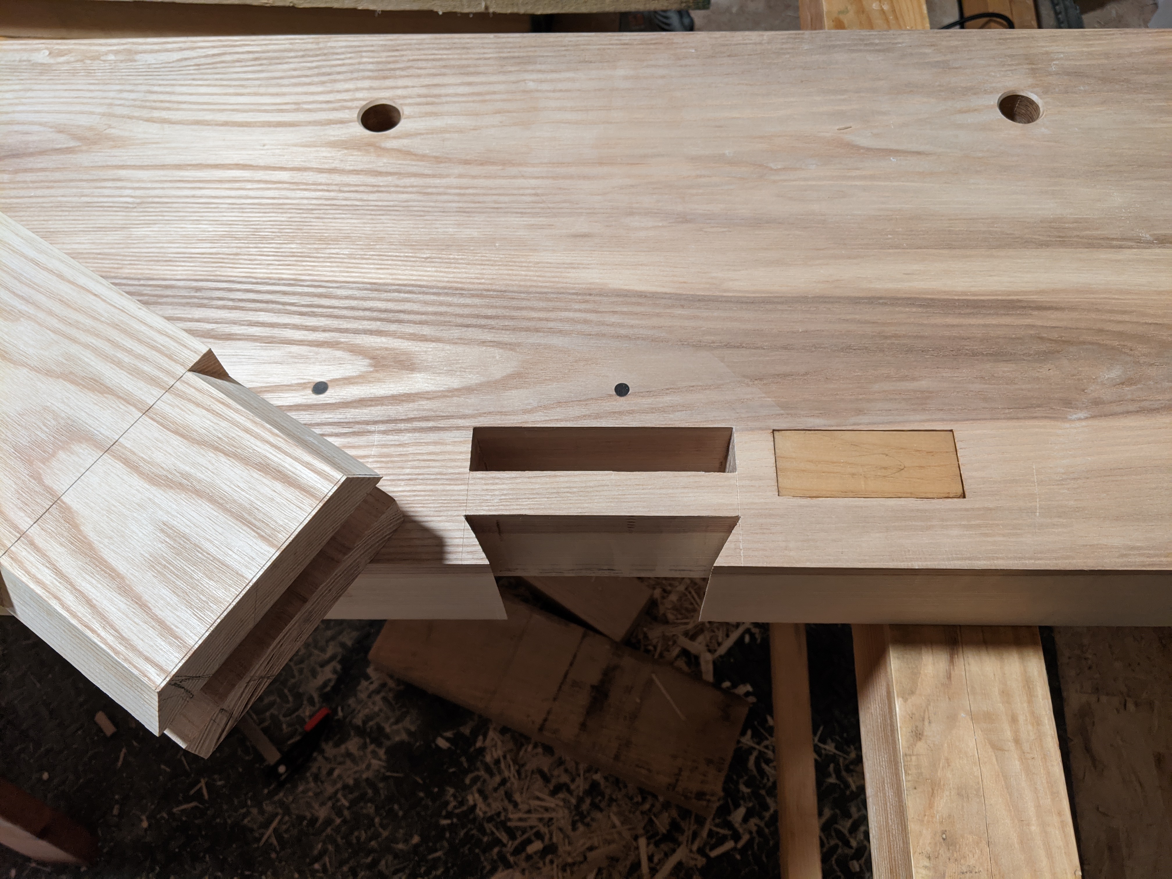 But it does look nice, especially after a few wedges fill up any remaining gaps. I apparently cut one of the joints a bit too tight, as a hairline split emerged along the front of the inside tenon. I don’t think it will be structural, and it doesn’t appear to have gone all the way through the slab. The glue joints are large and sound, so we’ll see if I need to drive some lag bolts in to secure it.