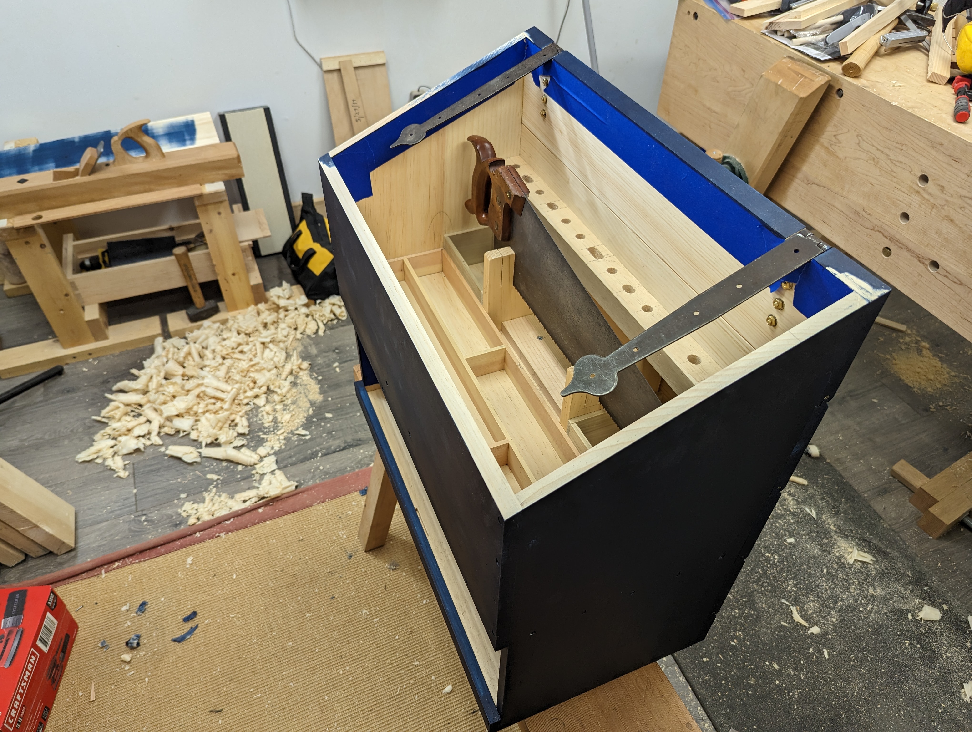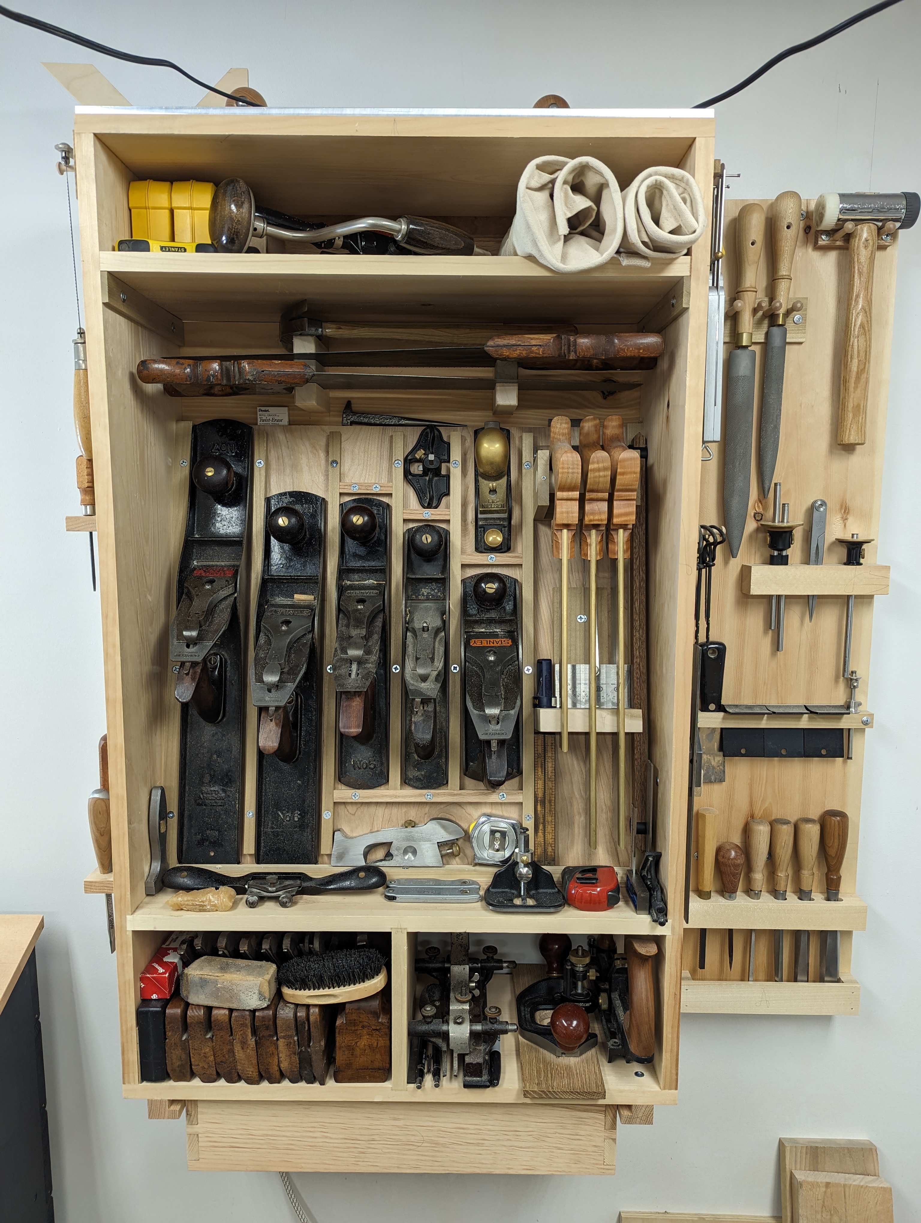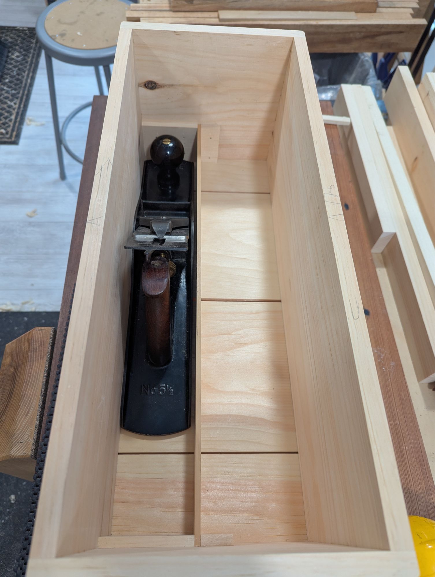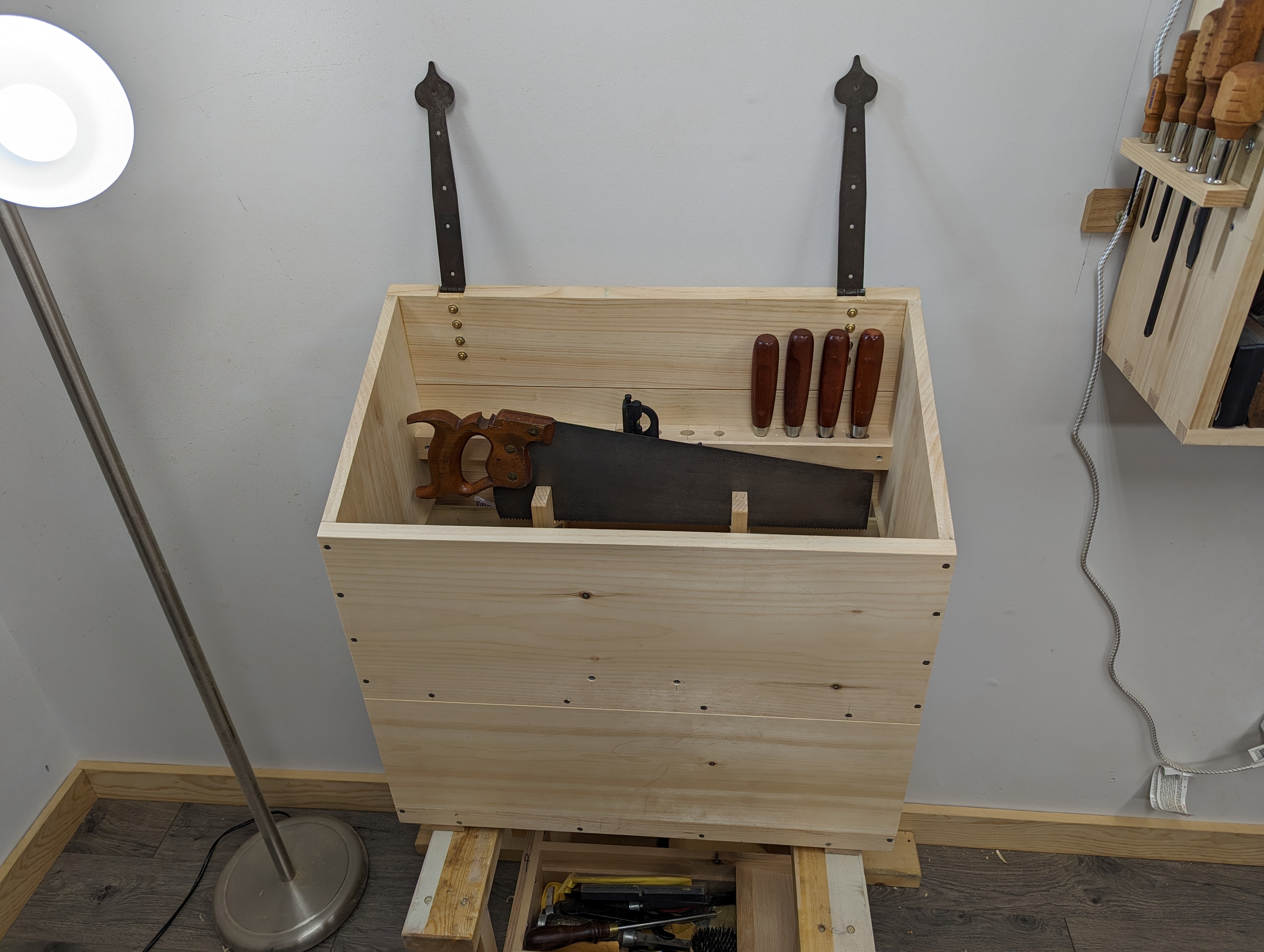 In a 20 x 8 toolbox, your jack plane will take up less than half of the total width, and not all of the length either. A hand saw till is about 1 1/2″ (38mm) wide and you can cram a few smaller tools around the saw itself. So you have around 4″ of width for everything else, which I typically fit out with a rack (for the edge tools and pokey bits) and another well for sharpening gear). You can make a lid with some depth to it that will add a new dimension (pun intended) to your storage space.