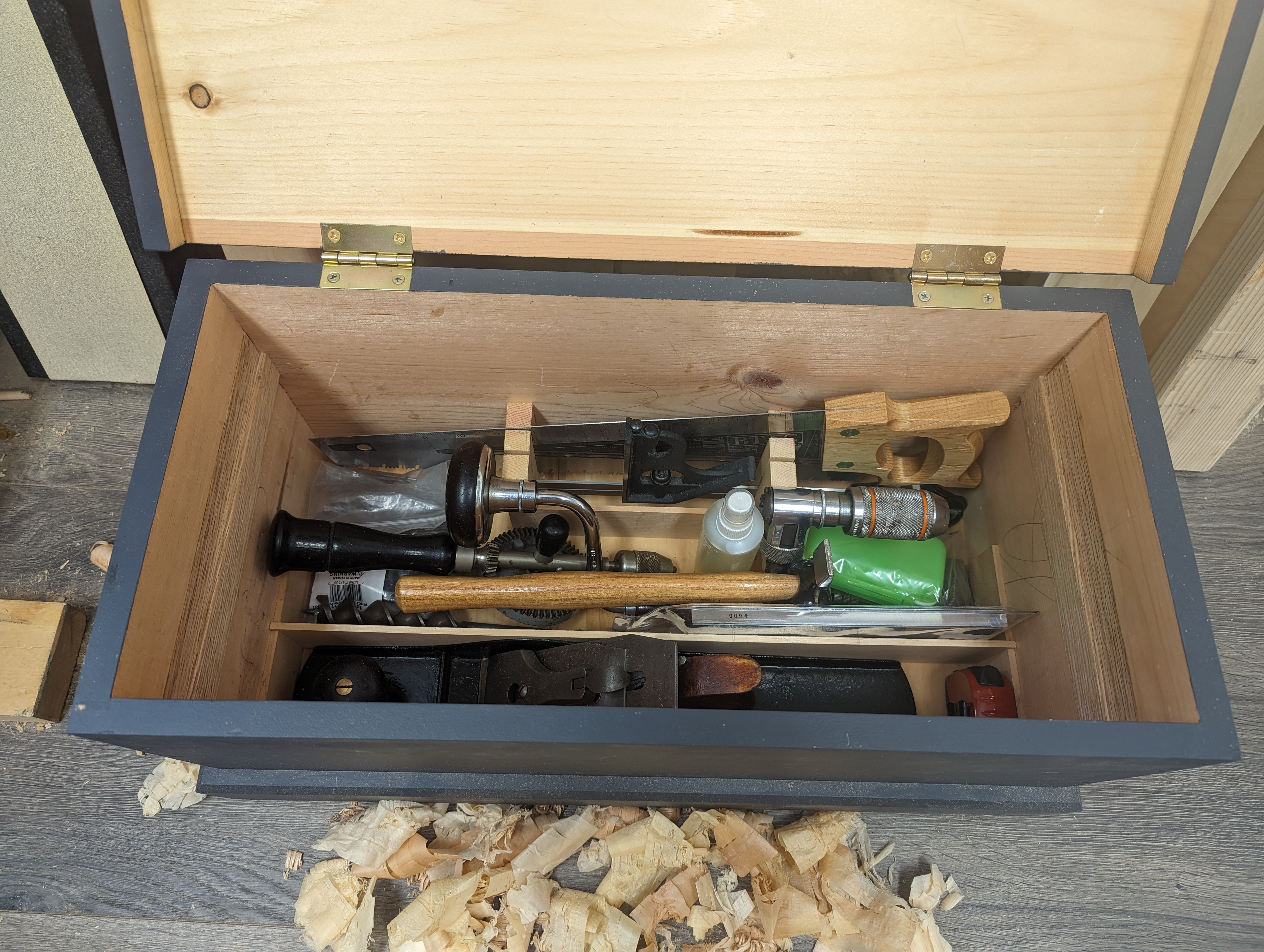 As shown by the links above, I’ve made a few traveling toolboxes in my day. Any tool storage solution should be customized to tools it will hold, of course. Though much trial and error, I’ve settled on the perfect size (using 5/8″ pine for the case) being roughly 22″ long x 11″ wide x 9″ high. This gives plenty of room in the well for a No. 6 Stanley (my preferred “single” plane), a saw till for a small panel saw (the BTC hardware store saw is shown below, but any small hardpoint saw will fit too) and combination square, a short sweep hand brace and bits, and an eggbeater drill, plus a hammer and a sharpening stone. If the chest were taller, I’d probably add a tool rack to the back wall of the well.