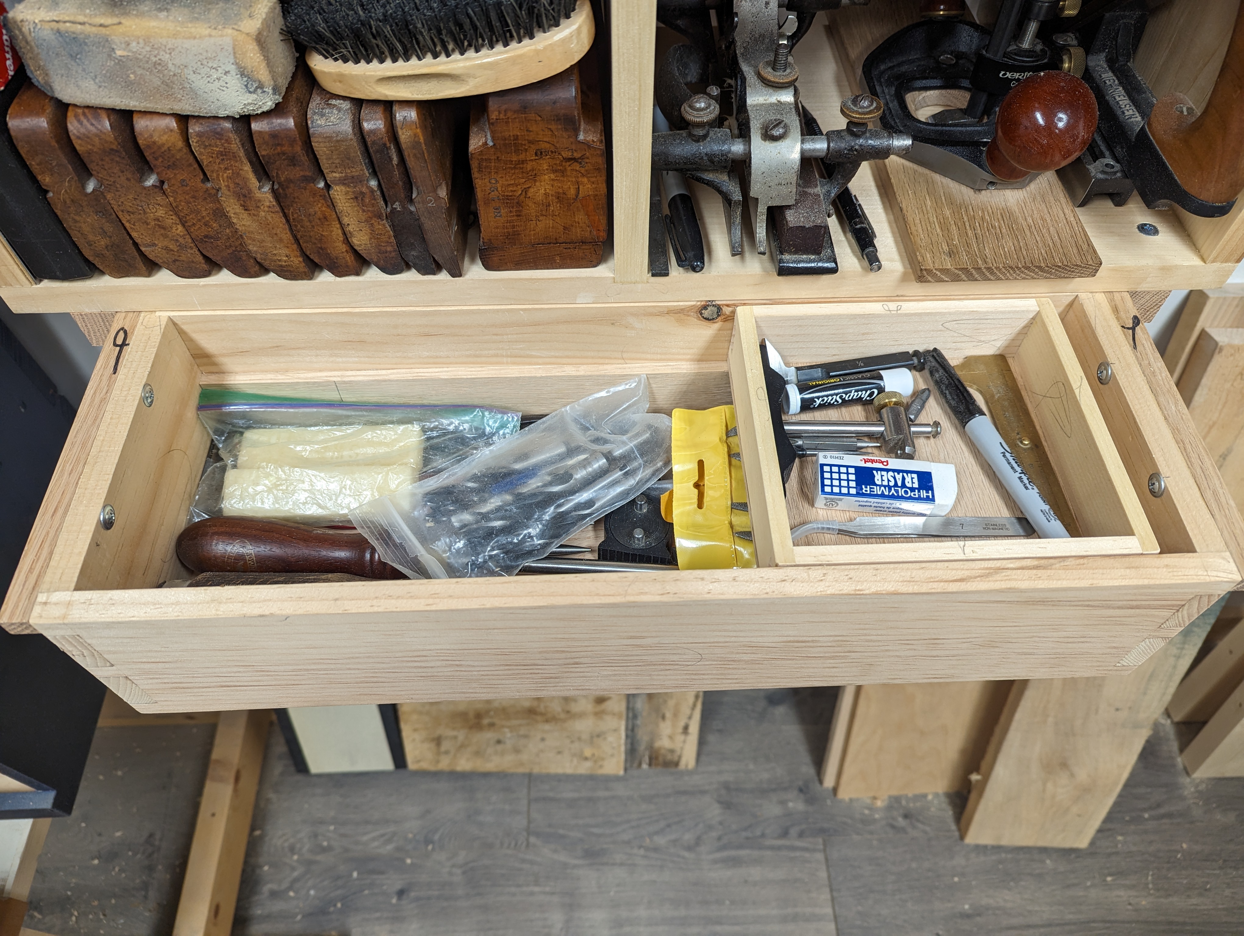 But a No. 6 is only about 5 1/4″ high, and even a panel saw in its till is less than 6″. What do do with the other 3+” of well space? A sliding tray, of course, that slides front to back and holds everything else I’ll need.