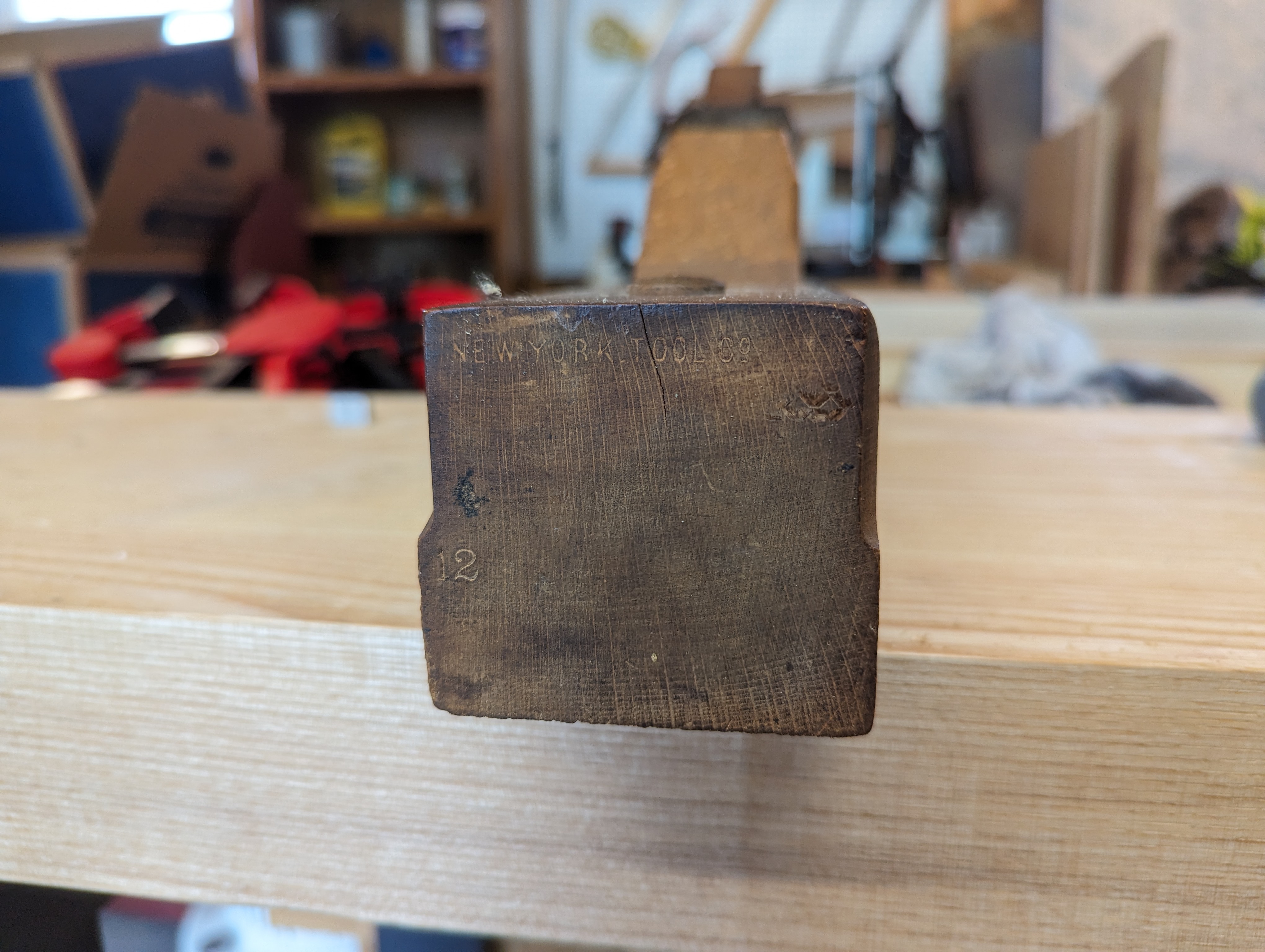 But the best find (in my opinion) was a wooden jack plane in remarkable condition. It’s stamped with “New York Tool Co.” (which my cursory research showed was a brand used by the Auburn Tool Co in the late second half of the 19th century). It’s 16 inches long and seems to be a No. 12. I didn’t even argue with the sticker price at the antique shop (which was $25).