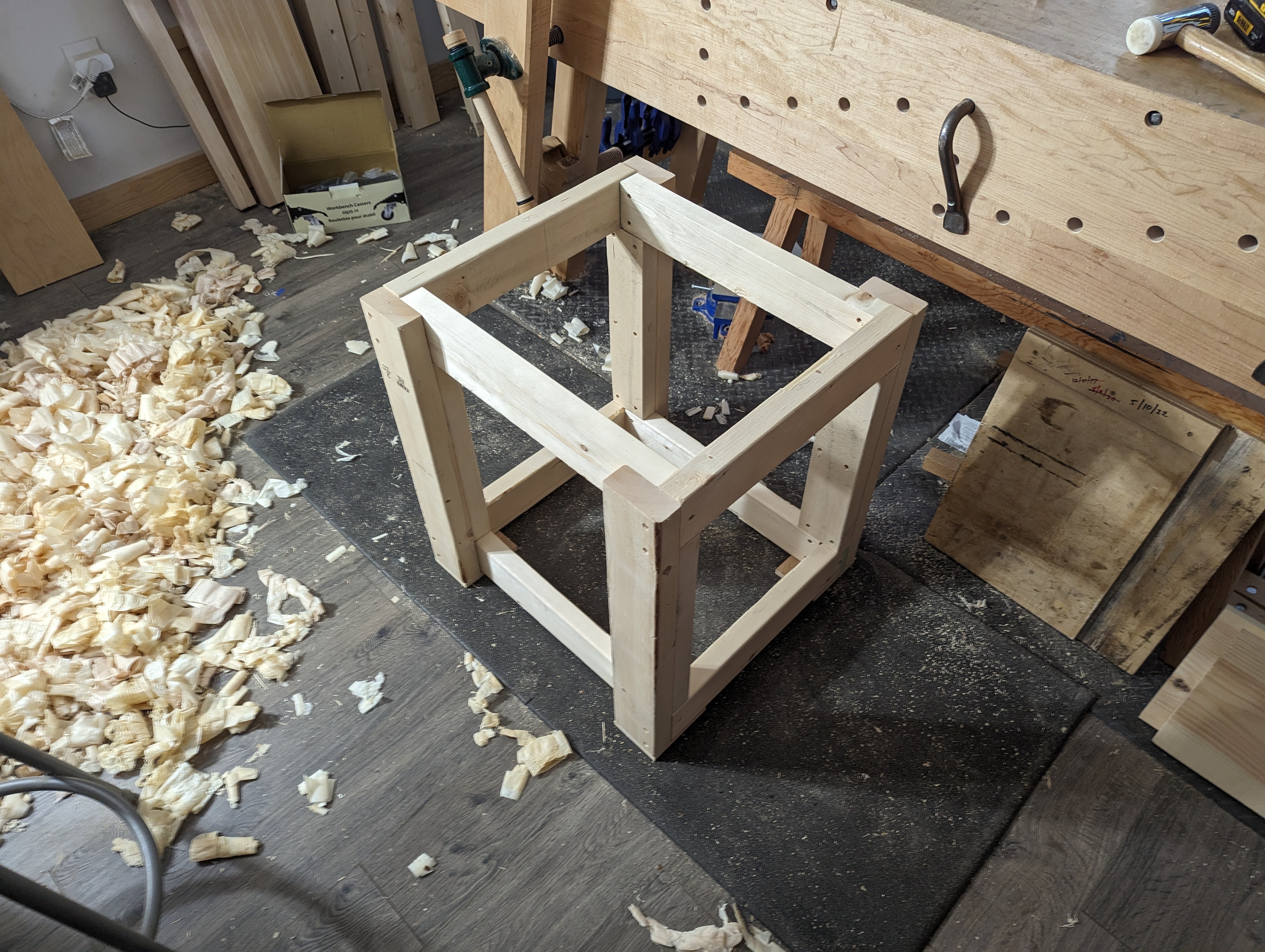 One of the important things about Mike’s design is leaving the top rails a bit proud (shown above), so they can be leveled with a hand plane to form a flat plane to attach the tabletop. This is very useful when using rough construction lumber but still wanting precision in the final piece.